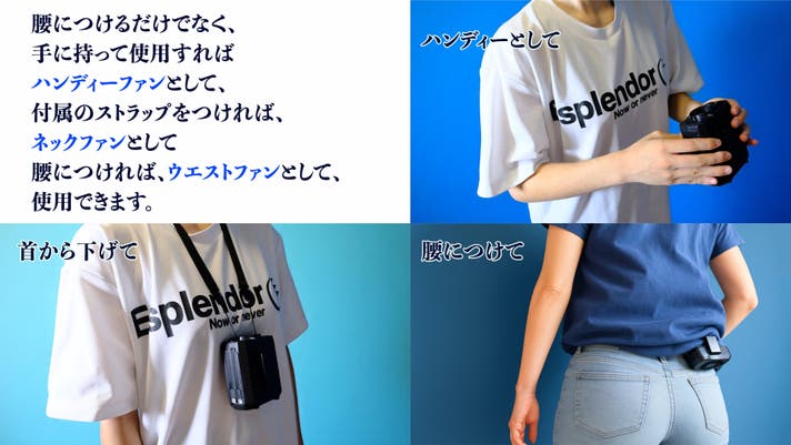 - 本体のフックを腰に引掛けるだけの簡単装着、涼しい風が背中から首元まで吹き抜けてひんやり爽快。