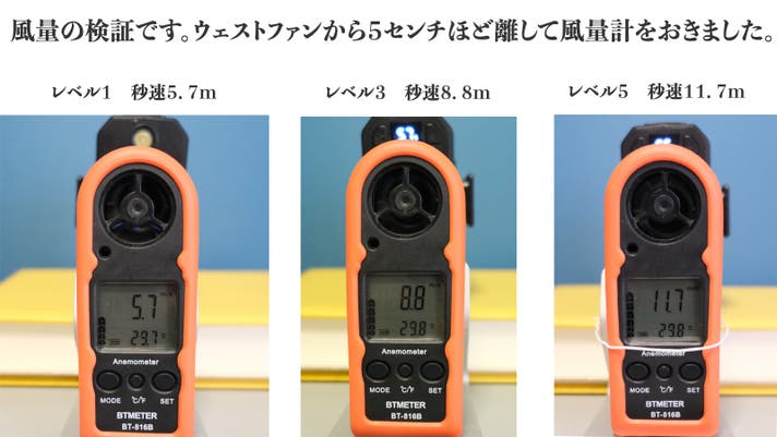 最大のレベル5では風量計が倒れてしまうほどなので縛っています。
