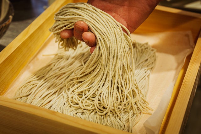 その時その時で最高の蕎麦粉を取り寄せて、店で蕎麦を手打ちしています。十割蕎麦の上品で豊かな香りもお楽しみください。