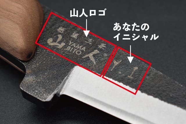 今回の「切り出し両刃ナイフ」は刃部に「山人」ブランドロゴを印字。その後ろに「ご自身のイニシャルを任意」で印字することが出来ます。