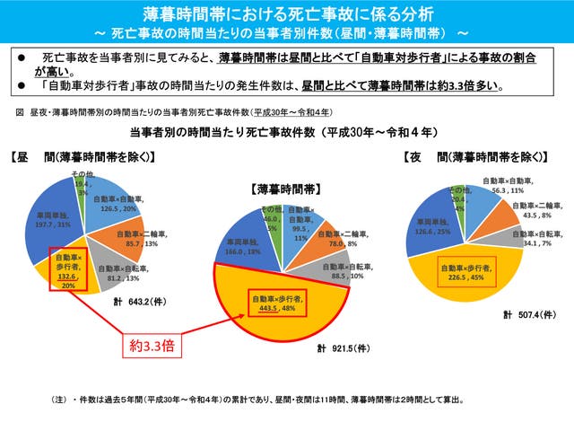 警察庁の報告によると、平成30年から令和4年の5年間における死亡事故発生状況を分析した結果、日没時刻と重なる17時台から19時台に多く発生していること、薄暮時間帯には、自動車と歩行者が衝突する事故が最も多く発生しており、事故類型別では、横断中が約9割を占めていることが判明しております。また、自動車運転者は前照灯の早めの点灯を行うとともに、歩行者や自転車利用者は明るい服装をしたり、反射材・ライトを活用し、自分の存在を周囲に知らせることを推奨しています。