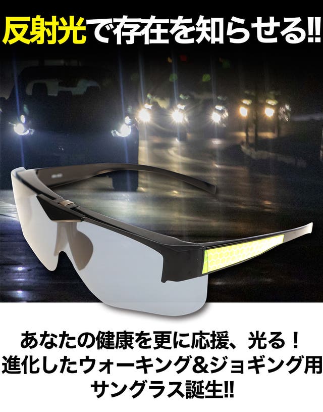 健康作りに、ウォーキングやジョギングを日々されている方も多いと思います。特に、朝夕の涼しい時間帯での運動は、清々しいです。しかしながら、薄暗い時間帯での運動は車の往来もあり、とても危険です。そんなときの為に開発したのが、この「光る反射シート付きウォーキンググラス」です。ドライバーも人影が少ない時間帯はスピードを出しがちです。車のライトがサングラスのシートに反射して、「光によって存在をお知らせ」します。健康作りを少しでもサポートしたい気持ちで、このプロジェクトが始まりました。今回の製品は、進化した第2弾です。共感する皆様の応援をどうかよろしくお願い致します。
