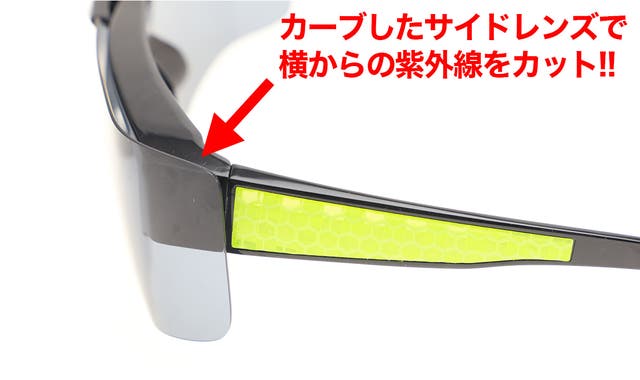 テンプルに、光を反射するシートが搭載されています。本品を使用することによって、より存在を知らせることができ、ドライバーにとっても事故防止に繋がる対策になります。