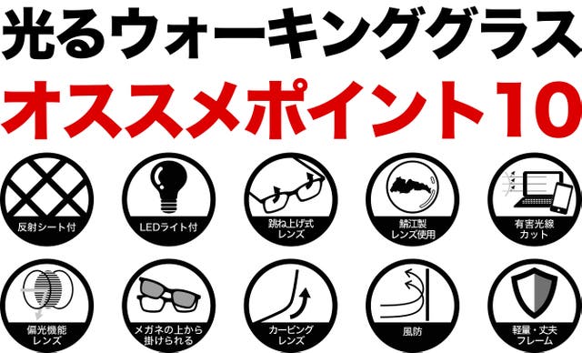 メガネ用のLEDライトを今回セットでご用意。角度も調整でき、テンプルの左右両方に付ければ、ウォーキングやジョギング中の「存在のお知らせ」度が更にアップします。クリップ取付け式で、お持ちの眼鏡にも取り付け可能。明るい視野で、読書やモノを見ることが出来ます。
