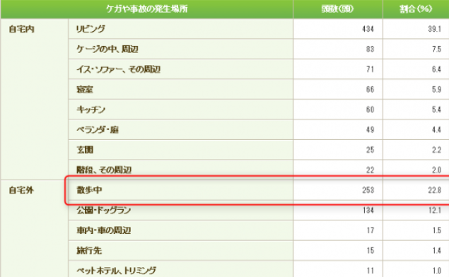 ペットの外傷の発生状況として一番多いケースが散歩中による事故です。
