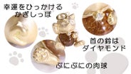ふくよかな体に癒しの笑顔。首輪にはダイヤモンドの鈴を付けています。幸運をひっかけてきてくれるという「かぎしっぽ」がトレードマーク。ぷにぷにとした肉球まで細やかに表現しました。