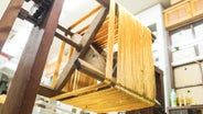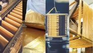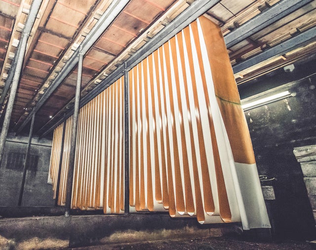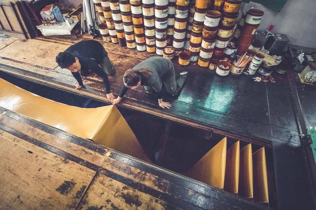 和紙の長さはなんと125メートル!漆をまとった和紙は、工房の床下の室(むろ)に収められ、約1か月の静かな眠りにつきます。こうしてざらついた質感の和紙がつややかに表情を変えていき、同時に強度も増していきます。このようにして次の箔押しの準備が整うのです。「漆は湿度の高いところで乾いていくんですよ。不思議でしょう?」職人さんは語ります。なるほど、名だたる日本の漆器の産地は確かに湿度の高い地域が多いですね。そう考えると、宇治川の川霧の立ち込めるこの地域は漆加工にうってつけの場所なのかもしれません。