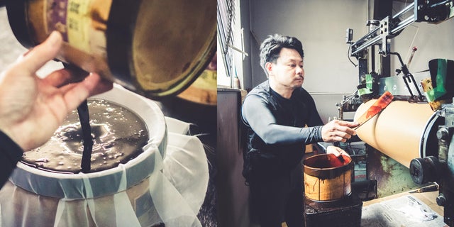 最初に案内していただいたのは、和紙に地漆を塗る工程。金糸の素材に和紙が使われていたとは正直言って驚きでした。ご夫婦で営む工房からは、時を刻むかのように一定のリズムの機械音が心地よく響いてきます。ご主人が真剣な眼差しで機械から繰り出される和紙に漆をひいていきます。漆の状態は気温や湿度により日々変化するので、職人さんは状況に合わせて幾種類もの漆を調合し、むらなく美しく和紙に塗り上げていくのです。