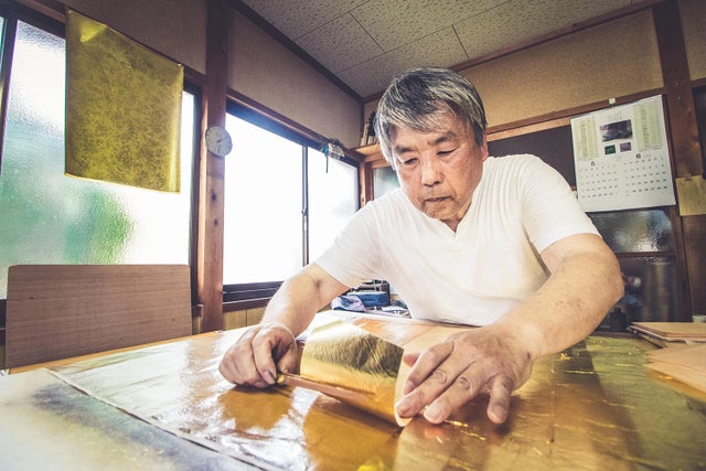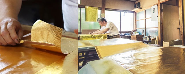 次に見学したのは箔押しの工房。この道50年のベテラン職人さんが、見事な手さばきで金箔を和紙に貼り付けていきます。使用するのは純度97.7%、一万分の3ミリまで打ち延ばされた金沢箔。ほんのわずかな風に吹かれても、くしゃくしゃっとなってしまう薄さです。呼吸さえもためらわれる緊張感のなか、寸分の狂いもなく5800枚もの金箔を貼り付けていきます。「こんなに薄い金箔ですからね。時には小さな穴が開いたり、しわが寄ってしまったりすることもあります。大事なのは修正力。この技術を得るには、経験が必要なんですよ」と、貴重なお話を聞くことができました。丁寧に根気強く箔を貼り続けて、まばゆく輝く黄金のシートがついに完成!圧巻の美しさです。