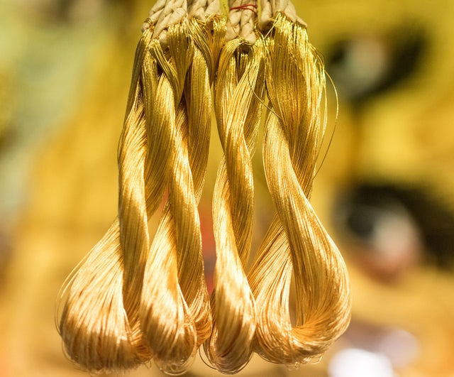 最後は人の手によって大切に大切に誂えられて糸の完成。伝統の織物や刺繍などを担う各地の職人さんへと届けられ、あでやかな作品へと姿を変えていくのです。