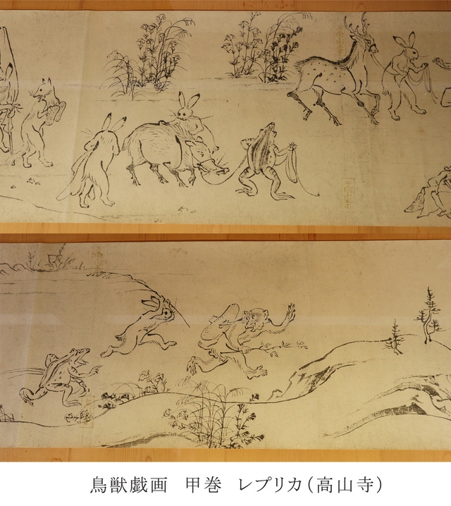 「鳥獣人物戯画」は京都栂尾山(とがのおさん)高山寺(こうさんじ)に伝わる国宝の絵巻物です。甲・乙・丙・丁の四巻からなり、動物や人物が遊びに興じる姿や架空の生き物などが墨一色で描かれています。