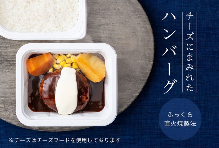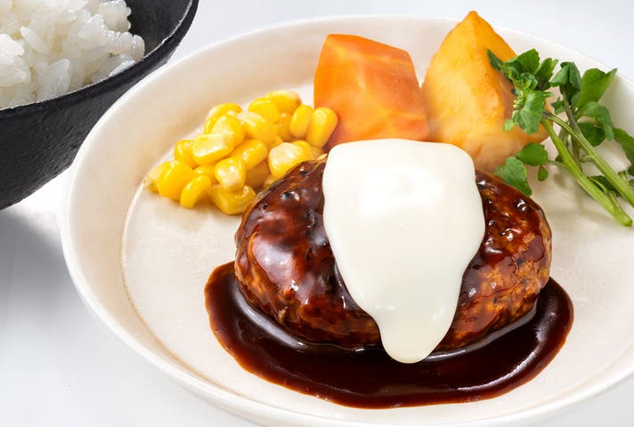 北海道産チーズを使用したチーズソースとデミグラスソース仕立てのハンバーグ。じゃがいもやにんじん、コーンが入っている為、食べ応えがあり満足度の高い一品です。