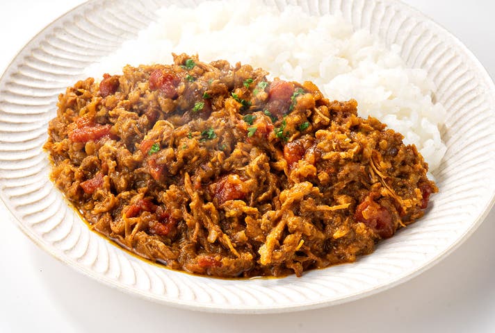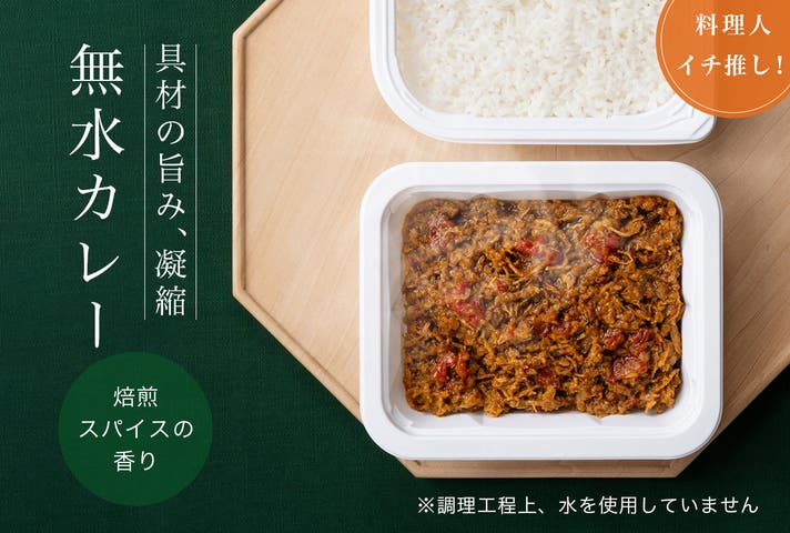玉ねぎ、トマト、ニンジンから出た水分のみを使用した無水カレー。香りにこだわった13種のスパイスに鶏肉を加え、ホロホロになるまでじっくり煮込みました。