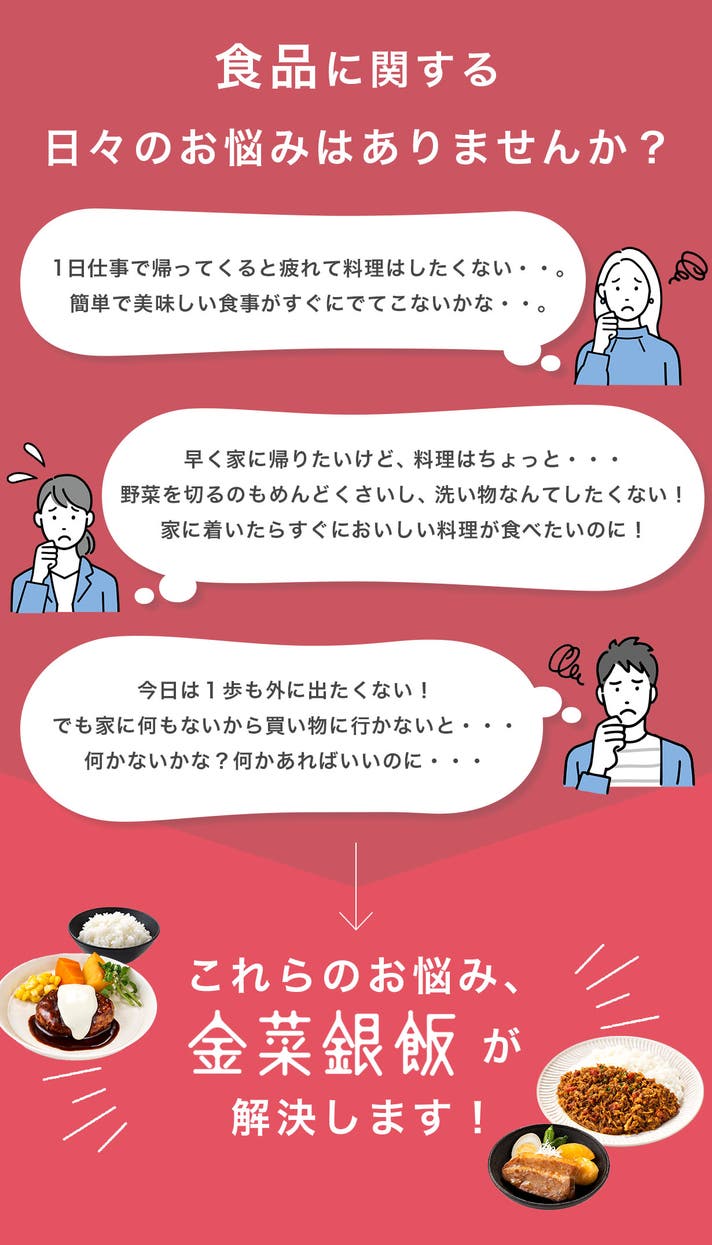仕事が忙しくて料理の時間が取れない、食事を簡単に済ませたい、ごはんを炊くのが面倒、自分の時間が欲しい。そんなお悩みを持つ方の為に、本格的な手間をかけたおいしい料理を作っておきました。