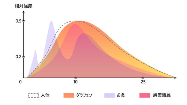 グラフェン(graphene)とは、人体に近い遠赤外線光波を発する結合炭素原子のシート状物質です。従来の加熱素材より熱伝導性が優れており、わずか数秒で急速加熱し、人体に近い6~14umの遠赤外線を生成して体を温めてくれます。