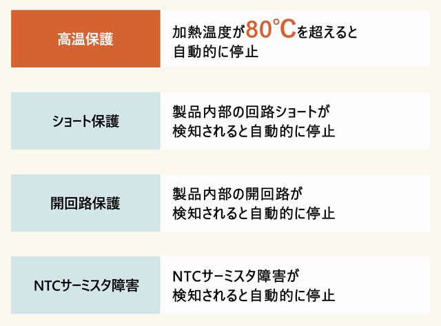 「Warm HL18」は高温保護、ショート保護など4つの保護機能を組み合わせて、よりセーフなご利用を保証しています。