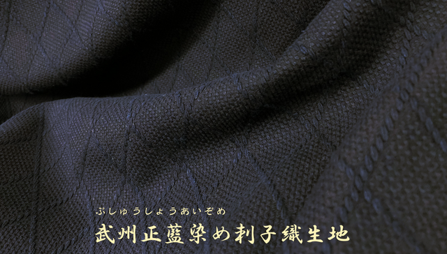 明治5年創業の老舗染工場で糸から職人技術により丁寧に染め上げ織られたブランド藍染、武州正藍染刺子織り生地を使用します。