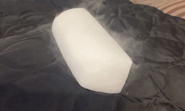 サイエンスを味方にした「WARM BLANKET」、断熱性の高さを実際に確かめるため布団上に-78.5℃のドライアイスを置いて検証しました。