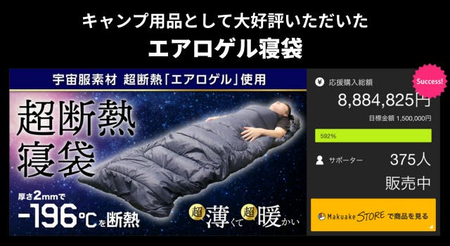 キャンプ用品として宇宙服素材を使用した超断熱寝袋「AERO WARM」(エアロワーム)は応援購入総額592%を達成、たくさんの方に応援いただき本当にありがとうございました。