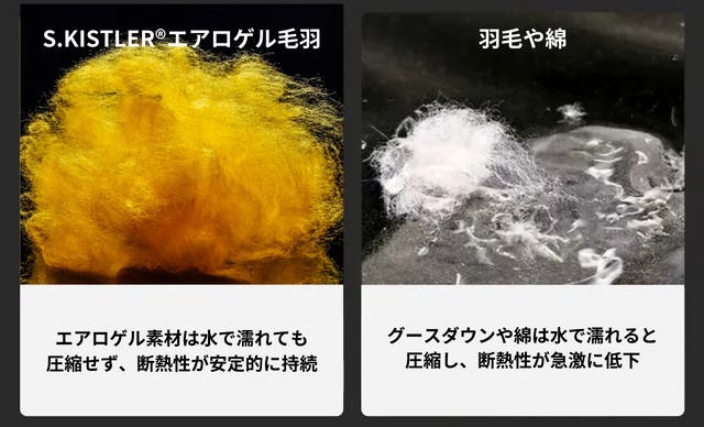 エアロゲル毛羽は抜けにくさと軽やかな着心地。動物繊維を使わず細菌の繁殖を抑え、ダックダウン特有の臭いもないです。さらに吸湿率がダウンのわずか1/6に過ぎず、湿気が多い環境下でも驚くほど暖かく、快適です。