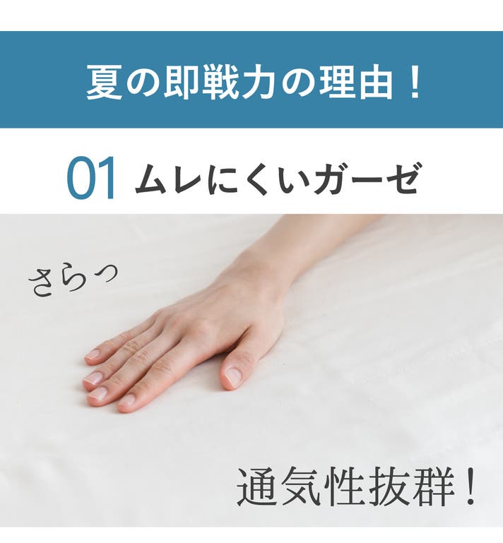 また、ガーゼは肌離れが良く、さらっとした肌ざわりで快適です。