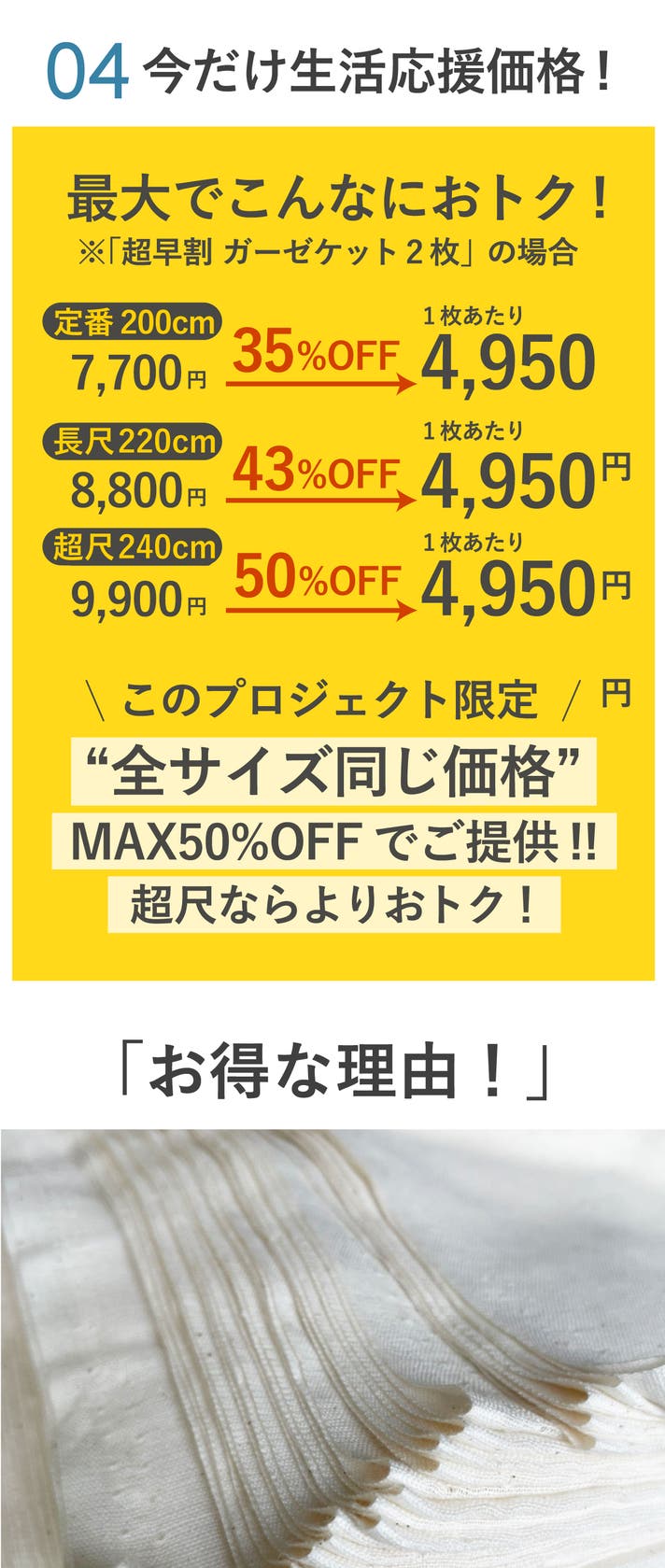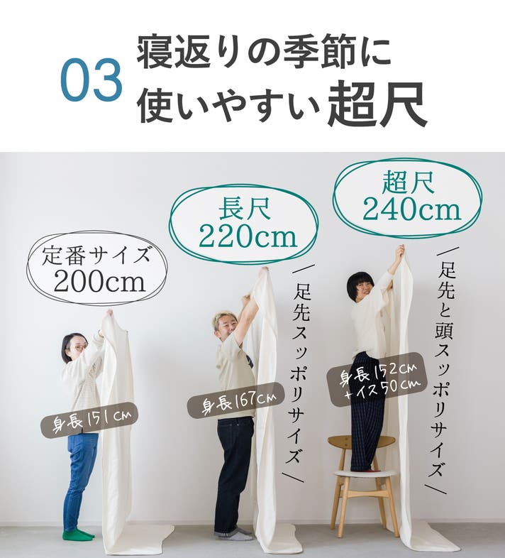 ガーゼケットサイズ:定番 200×140cm、長尺 220×140cm、超尺 240×140cm