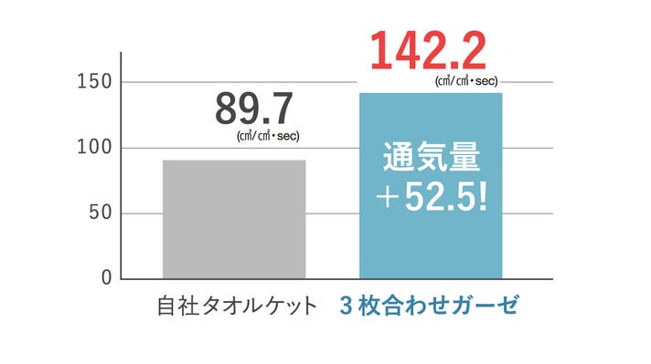自社タオルケットとの通気性を比較しました。通気性の良い5重ガーゼと比較しても、+52.5と高い数値となりました。