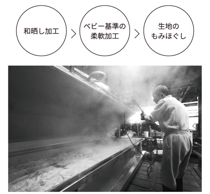 日本伝統の『和さらし』仕上げ。4日間天然水に漬け込み、繊維へのストレスを最小化することで、繊維が持つ丸みを壊すことなく、ふっくら柔らかく仕上げます。