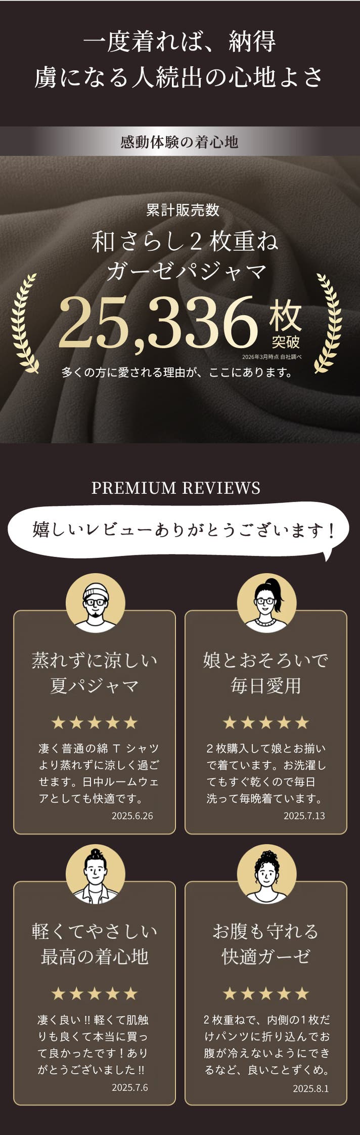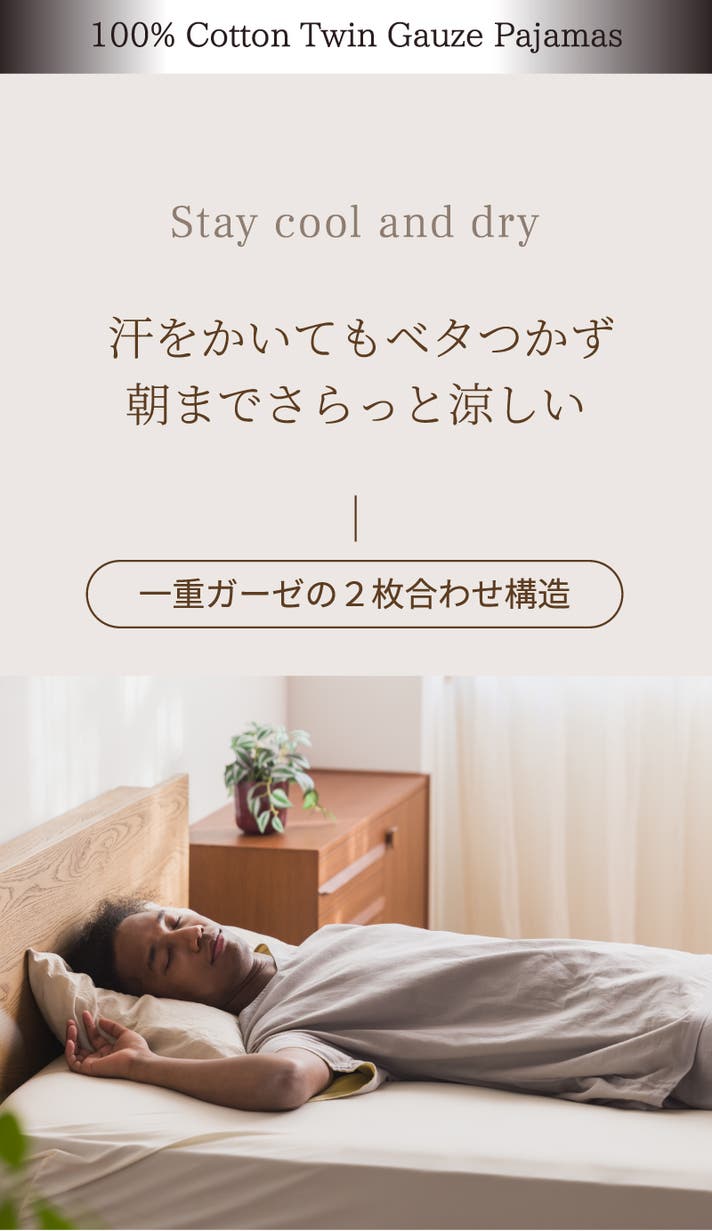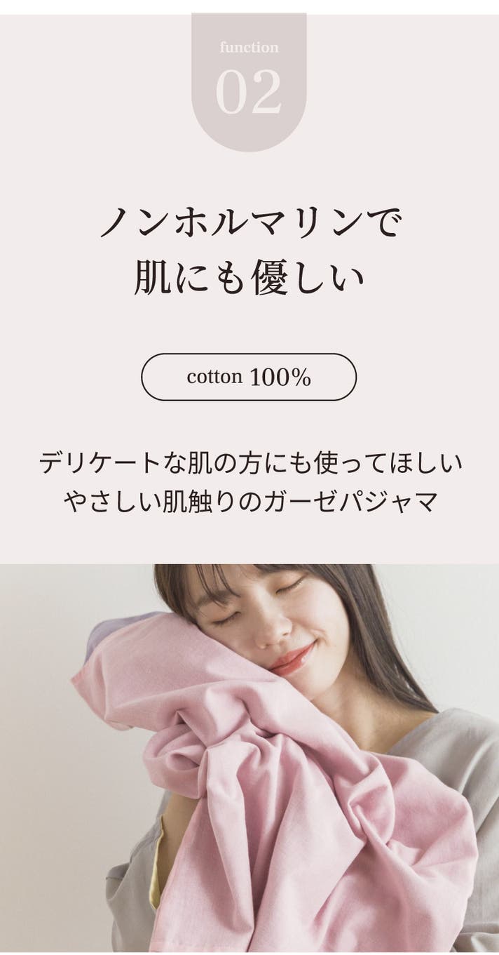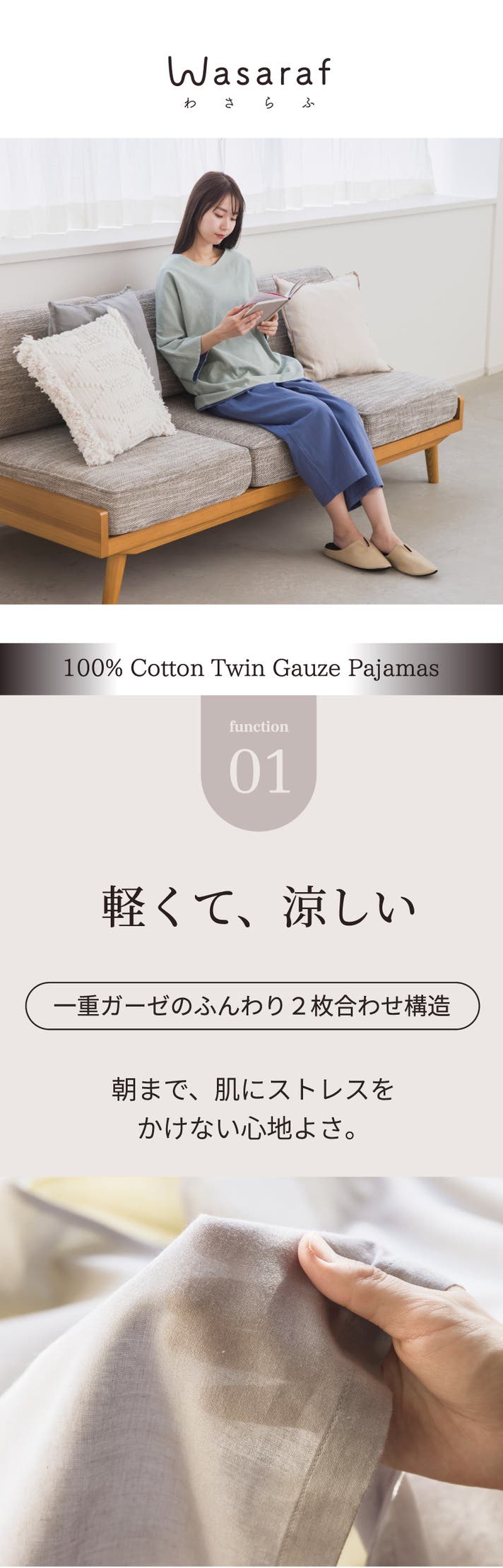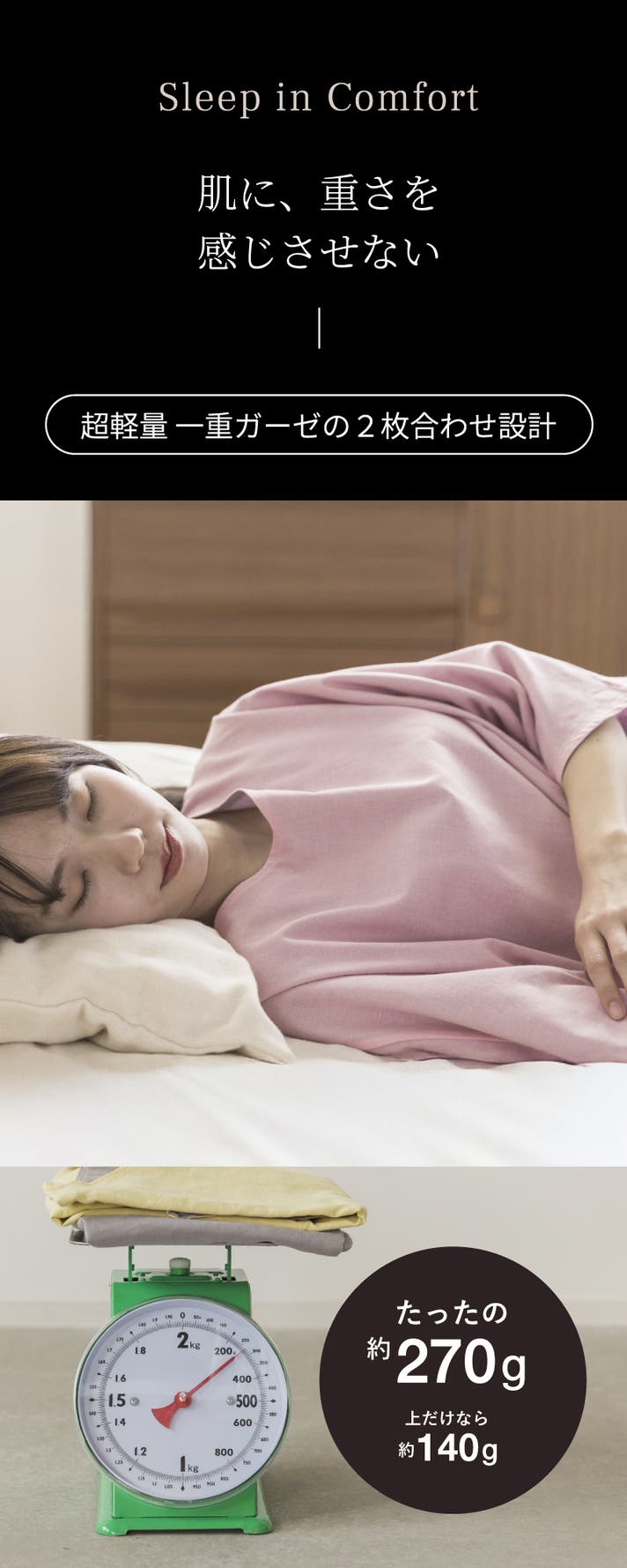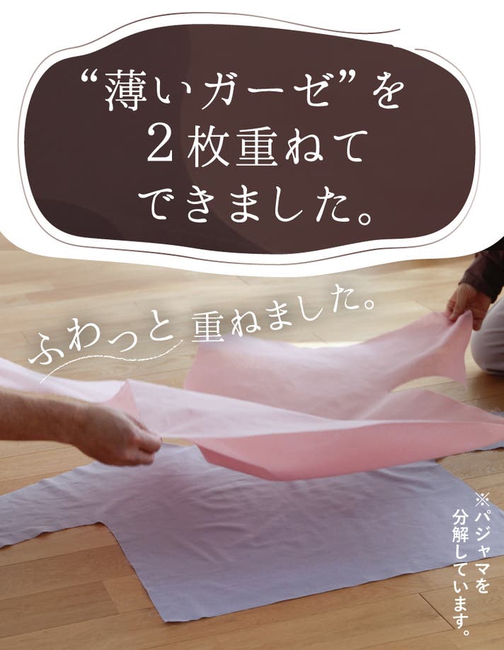 薄いガーゼが2枚重なった構造。上下で約270gの超軽量設計だから、肌に重さをかけず、やさしく包み込みます。