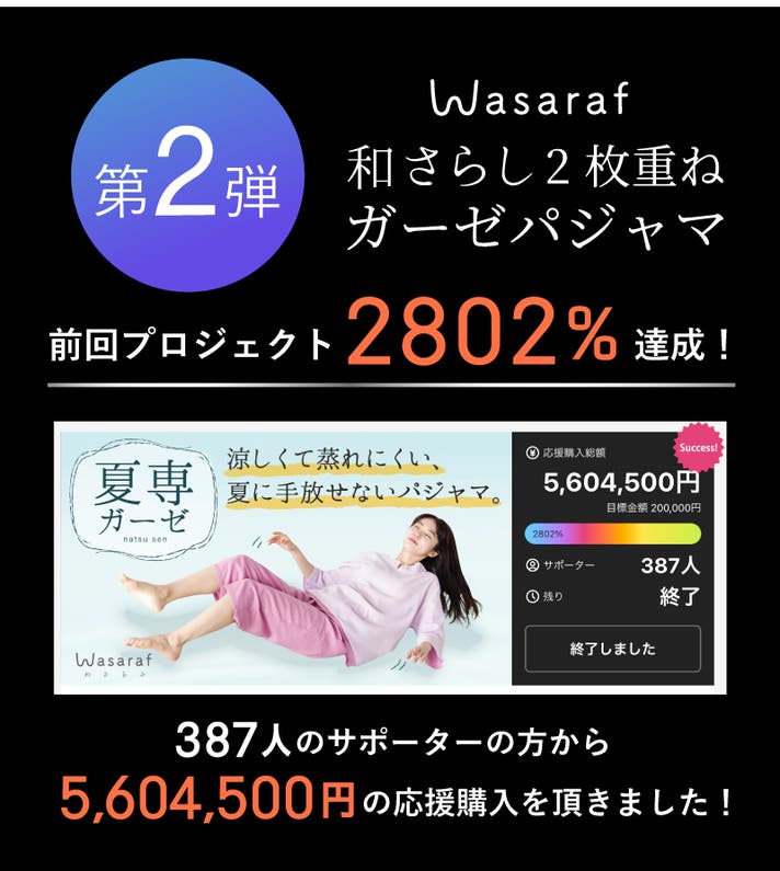 「Makuake(マクアケ)」は、実行者の想いを応援購入によって実現するアタラシイものやサービスのプラットフォームです。このページは、 プロダクトカテゴリの 「【肌想い優しさ設計】柔らかくて軽い。薄いガーゼを2枚重ねた夏に嬉しいパジャマ。」プロジェクト詳細ページです。
