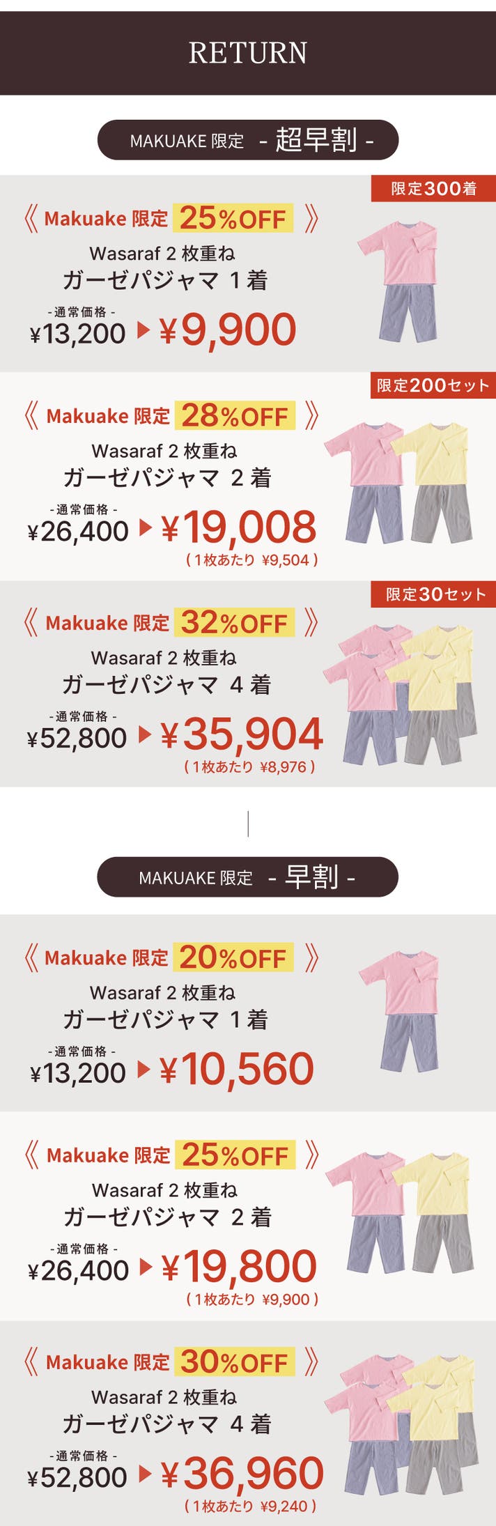 【超早割 32%OFF】Wasaraf 2枚重ね夏用ガーゼパジャマ 4着