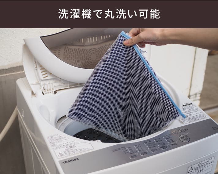 ご自宅の洗濯機で簡単に丸洗いが可能。外出先で汚れても気兼ねなくお洗濯できます。※お洗濯の際はネットをご使用下さい。