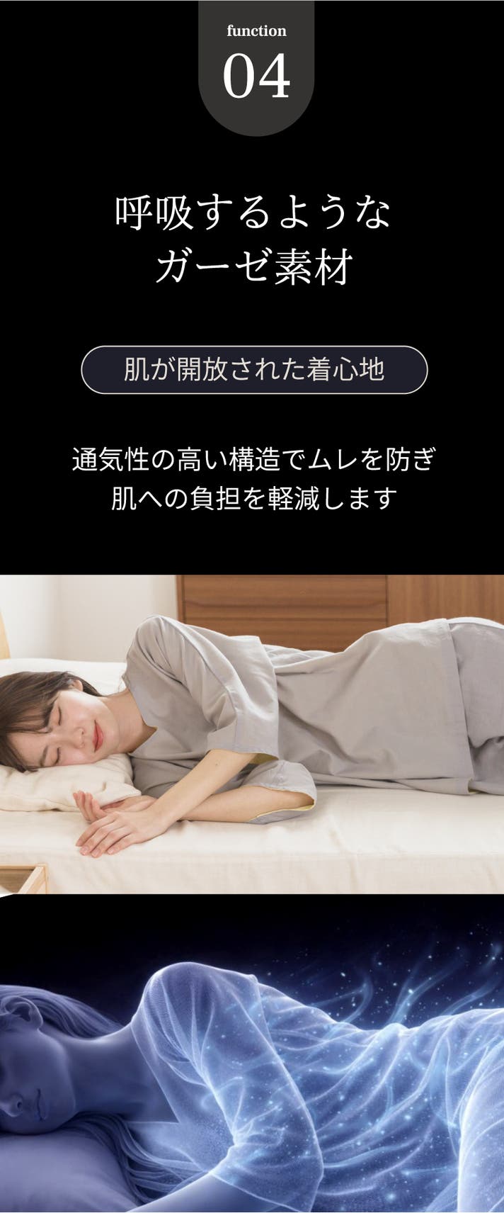 繊維の間にしっかり空気が通るため、汗や湿気をため込まず、一晩中やさしく肌を守ります。