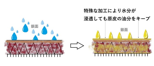 普通の原皮では、水に濡れると革に含まれた油分が抜け出てしまいます。油分がなくなると繊維が膠着して、表面が硬くなりひび割れが生じるなど元の風合いに戻らなくなります。さらに原皮を鞣(なめ)す工程で伸ばした部分が縮んでしまい型崩れします。また、水に濡れると表面の顔料が落ちて色移りがしやすくなります。