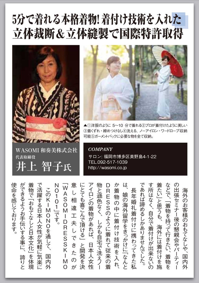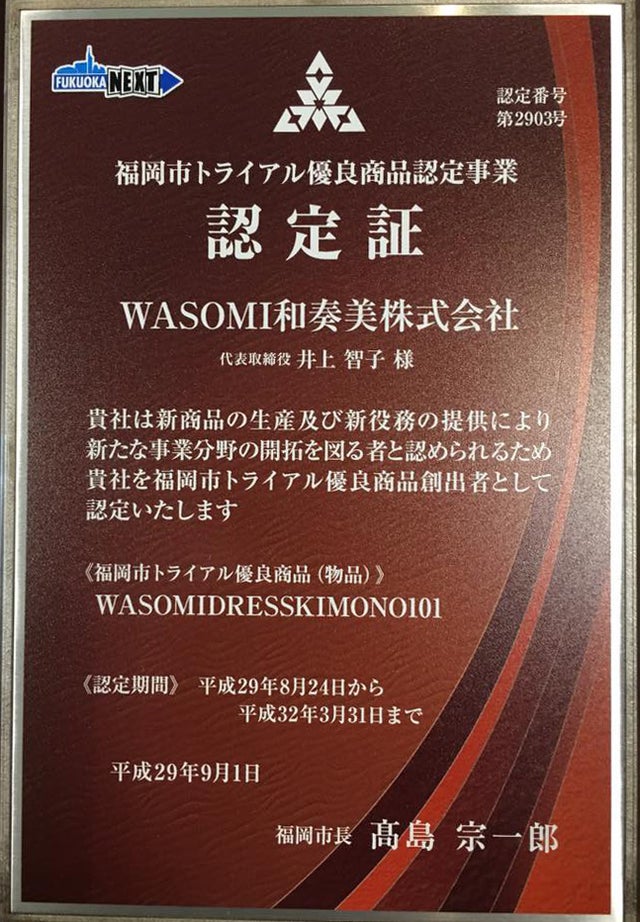 着付け技術をパターンにデザインした『衿と着物と帯』の3点セットは、ロウソクから電気、馬車から車に変わったように、50年後も日本人のアイコン着物又はファッションとして、気軽に経済的に日常的に着物が取り入れられている事を願って開発しました。国内に二部式を始めとする部分的な特許取得の着物は5つ存在します。WASOMIが特許を取得できたのは、既存の特許取得済みとの違いや優位性を、膨大なレポートで提出し新規性と進歩性を認められたからです。更にPCT国際特許出願では、新規性と進歩性と産業性の全てに最高得点を頂きました。