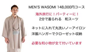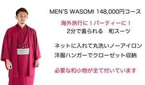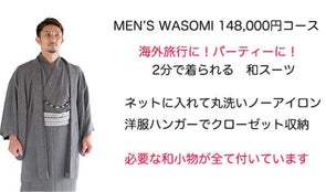 男性は、長襦袢Tシャツ,ステテコ,着物,ワンタッチ角帯,羽織,羽織紐,足袋,草履。必要な全てをガーメントバックに揃えたフルセットです。