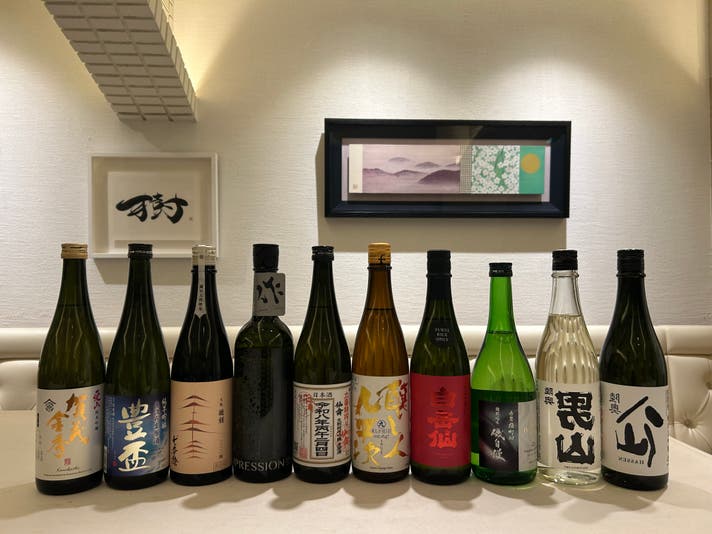 上記の「鯛尽くしコース」料理(十品)と共に、日本酒ペアリング付きのコースをご提供いたします。