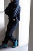 光沢のある生地をアクセントに使うことでスウェット=カジュアルからの脱却をイメージしました。