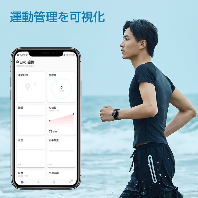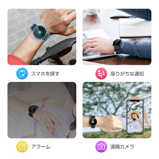 運動の時の日付、歩数、カロリーの消費、スマホ探し、座りがち注意、遠隔撮影、ストップウォッチなど多機能搭載したスマートウォッチです。