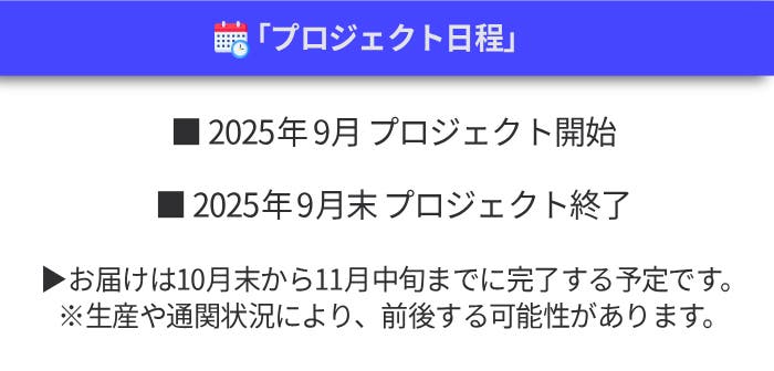 このプロジェクトはAll in型です。目標金額の達成に関わらず、プロジェクト終了日の2025年09月29日までに支払いを完了した時点で購入が成立します。