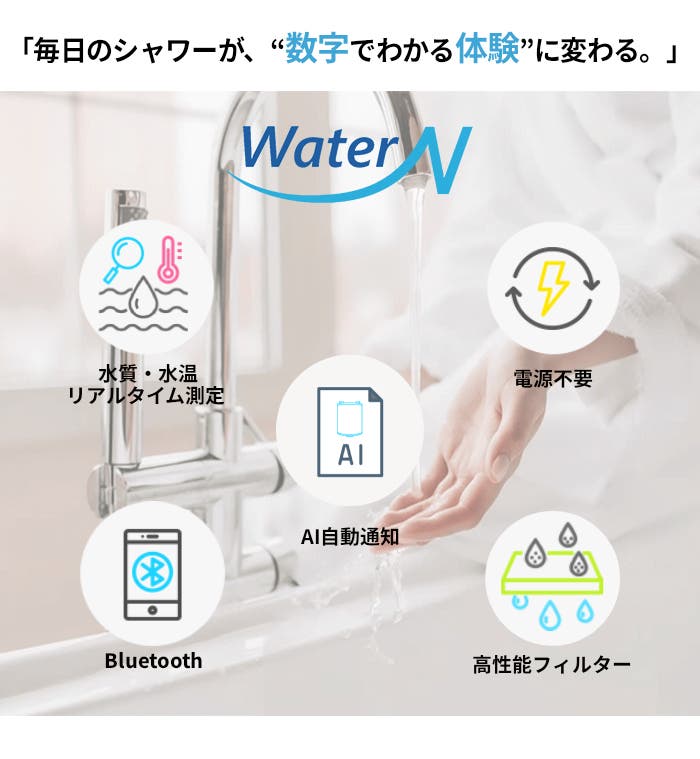 「Makuake(マクアケ)」は、実行者の想いを応援購入によって実現するアタラシイものやサービスのプラットフォームです。このページは、 プロダクトカテゴリの 「約7年間電池不要AI水質見える化スマートシャワーソリューション【Water-N】」プロジェクト詳細ページです。