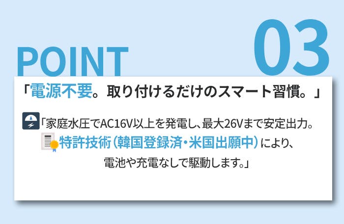 - 電源不要・約7年間電池不要、自己発電で水質・水温を確認