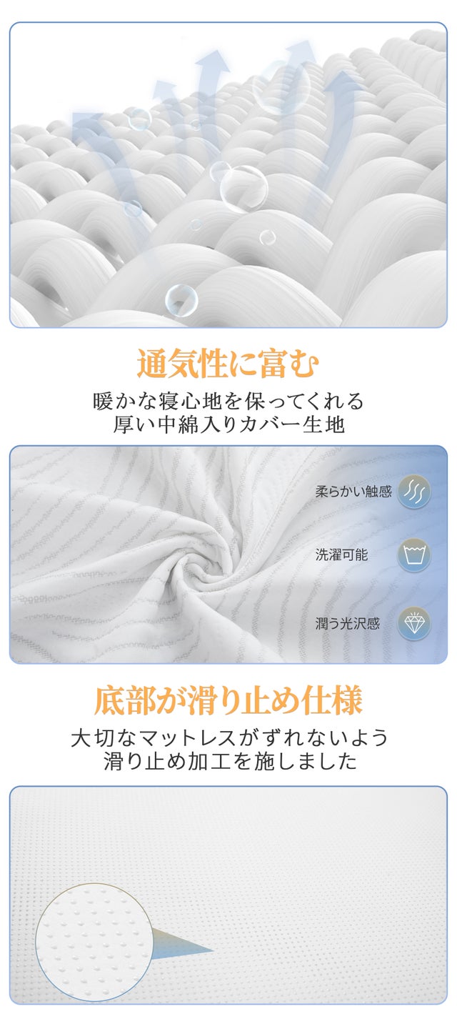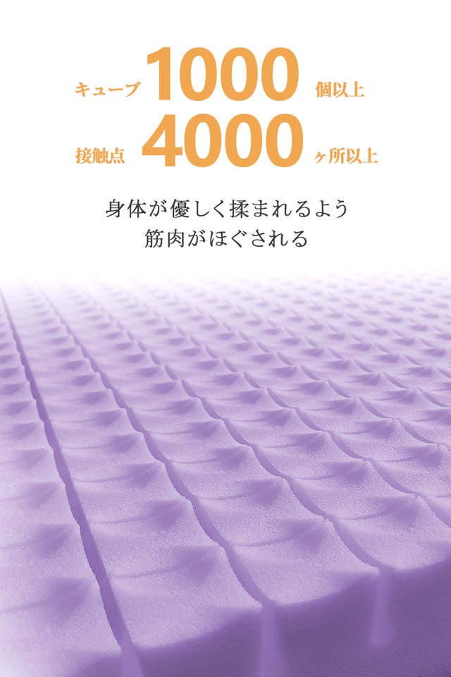シングルサイズなら横24行×縦48列合計1152個のキューブもカットされた3D立体構造により、熱がこもりやすいことが弱点だったウレタンに、通気を促進するスリットが空気の通り道を作り、湿気や汗などの水分を速やかに発散し、通気性が抜群でムレせずいつでも手触りサラサラ、体が喜んで快眠出来ます。夏場でも一晩中快適にお使いいただけます。