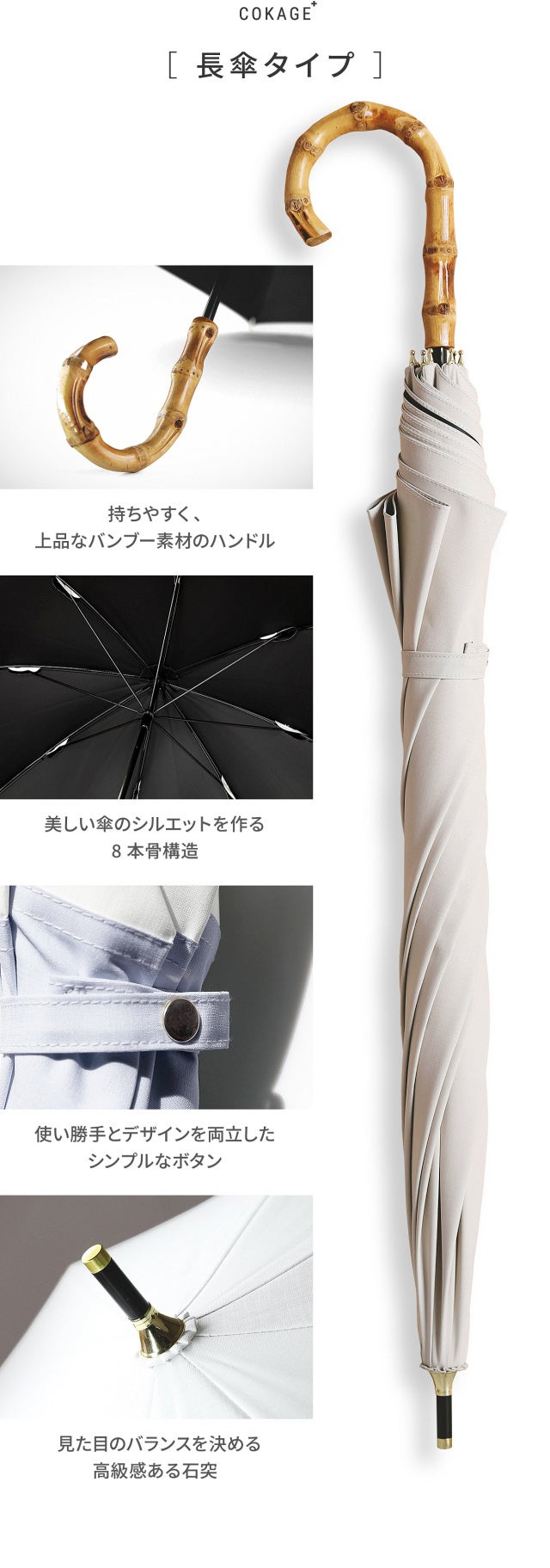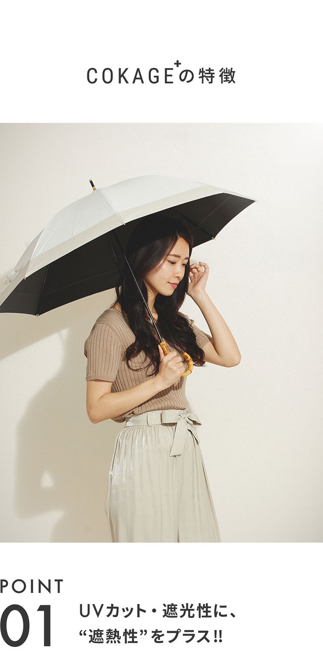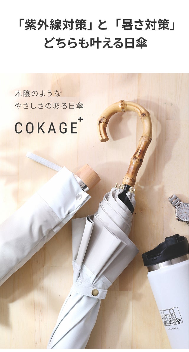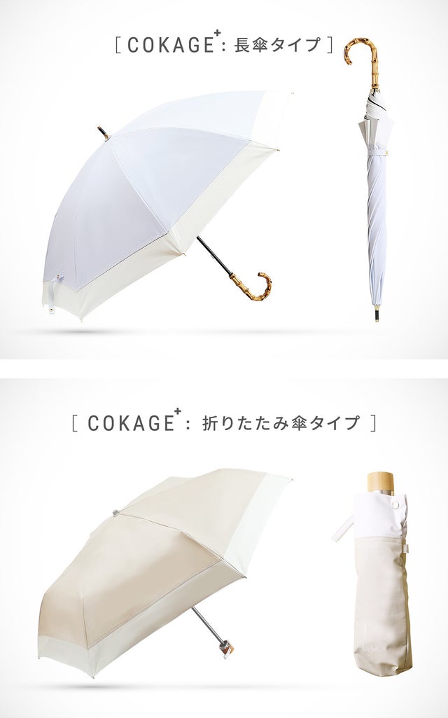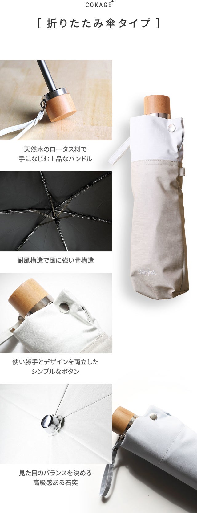 「COKAGE+」に使用されている生地は雨傘にも負けない高い撥水・防水性能で、日傘としてはもちろん、雨天時でも使用可能な晴雨兼用傘です。