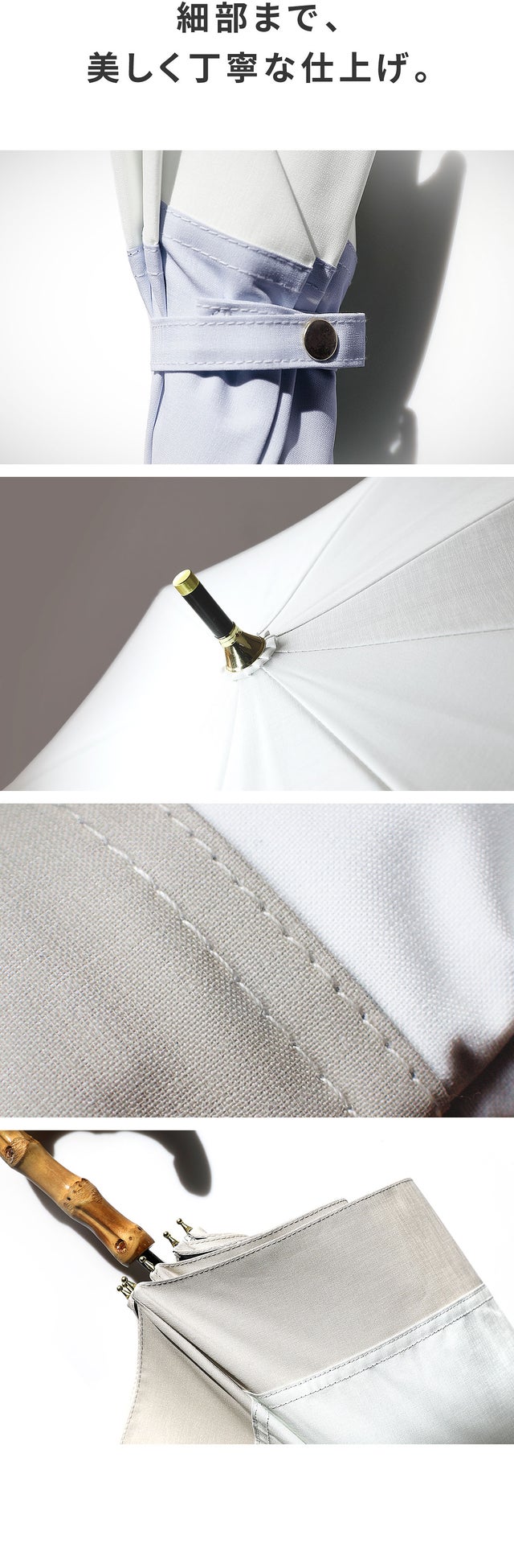 シンプルなデザインだからこそ普段の服装や生活にすっとなじみ、しかも軽量で晴雨兼用!日常に溶け込む日傘になってほしいからこそ、機能だけではなく、見た目にもたくさんのアイデアをつめこんたデザインになっています。