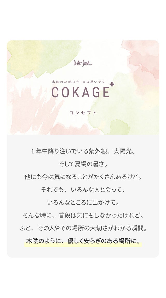 こういった太陽の刺激から、毎日ずっと守ってくれるような存在。そっと日差しを遮ってくれる、「木陰のようなやさしさのある日傘」をお届けするために、私たちは「COKAGE+」を開発しました。
