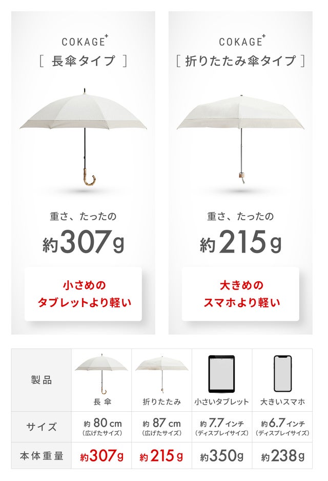 「COKAGE+」は3層構造の生地のため、本来重量のある傘生地ではありますが、FRP強化骨*や骨構造の軽量化等により長傘タイプは約307g、折りたたみ傘タイプは約215gという軽さを実現しています。