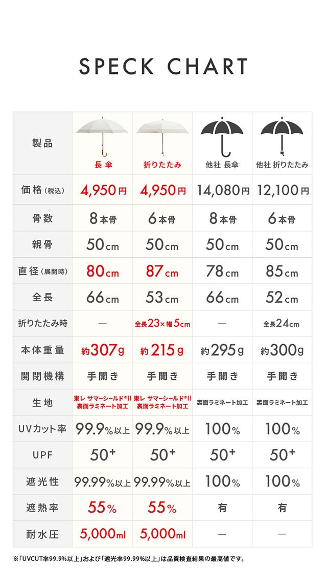 品質検査の結果では遮熱率55%を獲得。暑い日の外出であっても、傘が常に太陽からの熱を遮るため、木陰を持ち歩いているような涼やかさをご体感いただけます。
