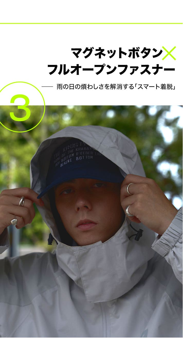 このレインウェアは、単に雨を防ぐだけでなく、独自のフルオープンファスナーやマグネット開閉システム、そして身体に馴染む高弾性素材を用いることで、雨の日のあらゆる動作をスムーズに快適にしてくれます。