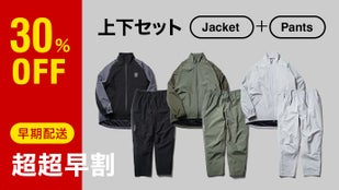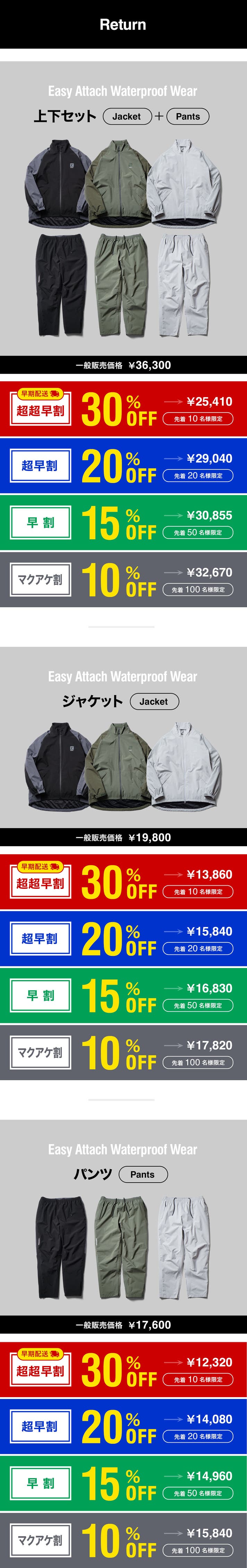 「超撥水機能」が標準装備され、フードはポケットから取り出してワンタッチで装着、パンツも靴を脱がずに数秒で装着できる